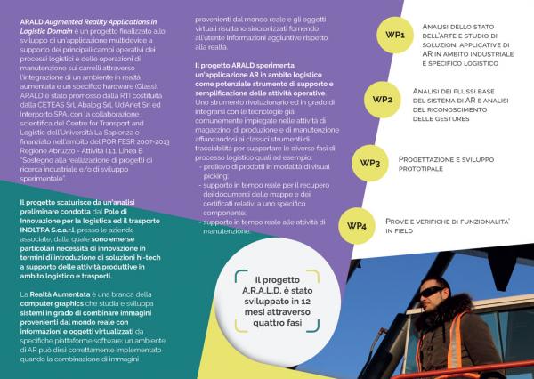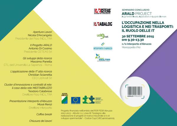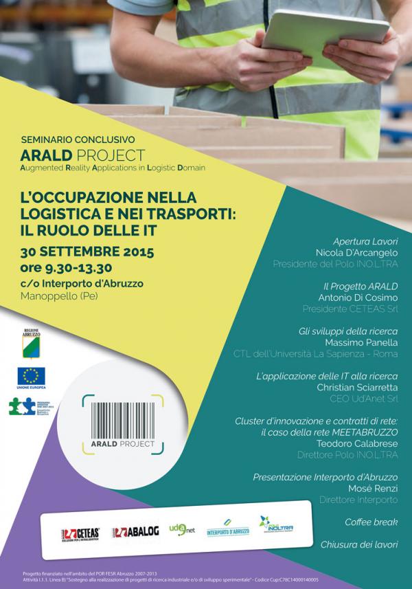L’evento realizzato in collaborazione con il Polo INOLTRA ospiterà alcuni Istituti superiori pescaresi con percorso formativo a tema e Aziende di Trasporto e Logistica del territorio. Arald, acronimo di Augmented Reality Applications in Logistic Domain (le applicazioni di Realtà Aumentata nel settore della Logistica) è un progetto di Ricerca e Sviluppo realizzato dall’azienda abruzzese Ceteas Srl, insieme alla Abalog srl, entrambe società del Gruppo Di Cosimo, in collaborazione con il Polo Inoltra, l’Interporto d’Abruzzo, la Ud’Anet, spin off tecnologico dell’Università degli Studi “G. D’Annunzio”. La ricerca, cofinanziata nell’ambito del Programma Operativo Regionale – F.E.S.R. Abruzzo 2007-2013 (“Attività1.1.1. Sostegno alla realizzazione di progetti di Ricerca Industriale e/o Sviluppo sperimentale per le imprese aggregate a ulteriori Poli di Innovazione – Linea B) ha visto inoltre la partecipazione del C.T.L. (Centre for Transport and Logistics), il centro di ricerca per i Trasporti e la Logisitca dell’Università “La Sapienza” di Roma.