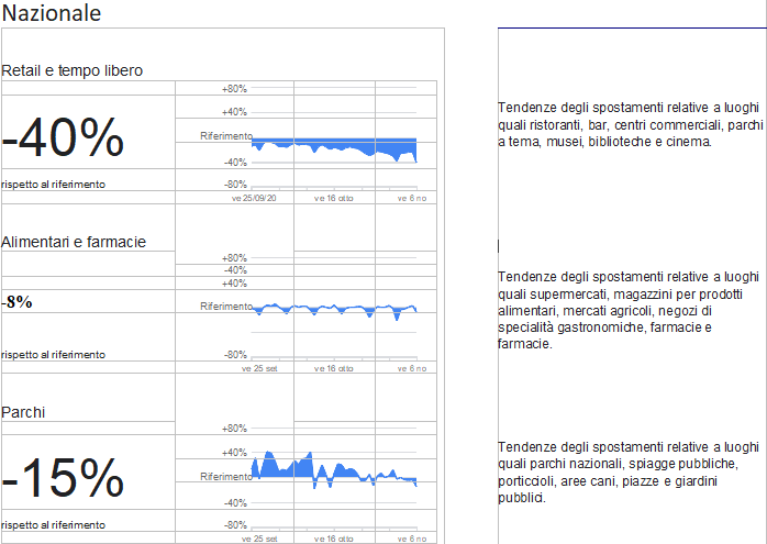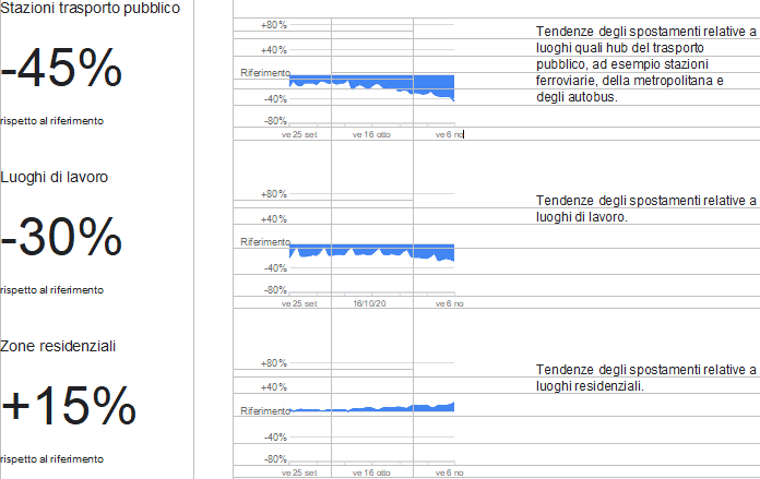 I recenti Dpcm del Governo italiano hanno deciso la chiusura di numerose attività per limitare gli spostamenti delle persone al fine di limitare la diffusione del COVID-19. In questo senso è utile analizzare la contrazione degli spostamenti che si è registrata. Ciò è possibile attraverso i dati forniti da Google che, con il suo rapporto sugli spostamenti della comunità, offre un quadro di quanto sta accadendo in Italia. Il primo report di Google sugli spostamenti risale ad aprile, e nei mesi successivi ci sono stati vari aggiornamenti. L’ultimo dei quali, che reca la data di venerdì 6 novembre, considera la situazione italiana delle ultime settimane, a partire dalle prime misure introdotte con il Dpcm del 13 ottobre fino alle più recenti limitazioni con il Dpcm del 3 novembre che ha diviso le regioni italiane in tre fasce (rossa, arancione, gialla).