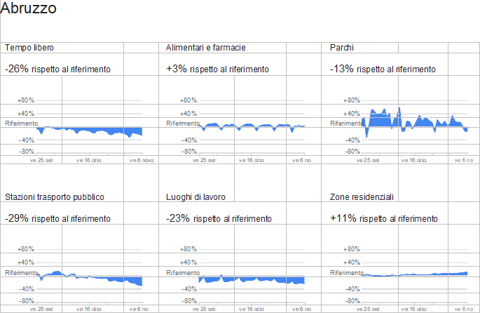 L’Abruzzo al 6 novembre, era ancora in zona gialla. In Abruzzo, Google ha registrato: -26% retail e tempo libero; -13% parchi; -29% stazioni trasporto pubblico; -23% luoghi di lavoro; +11% zone residenziali. È interessante verificare come la percentuale degli spostamenti verso alimentari e farmacie sia positiva, +3%. Infatti in zona gialla ci si può spostare liberamente durante la giornata, senza bisogno di autocertificazione, che invece diventa obbligatoria per circolare dalle 22 alle 5. Nonostante le minori limitazioni e chiusure (bar e ristoranti possono restare aperti fino alle 18), la percentuale sugli spostamenti verso questi luoghi resta negativa, anche se ben distante da quella registrata nelle zone rosse.