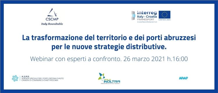 CSCMP – Council of Supply Chain Management Professional, ASPO – Azienda Speciale per i porti di Ortona e di Vasto della Camera di Commercio Chieti Pescara, ARAP – Azienda Regionale delle Attività Produttive Regione Abruzzo e Polo Inoltra Trasporti e Logistica organizzano un webinar per venerdì 26 marzo alle ore 16:00 a tema “La trasformazione del territorio e dei porti abruzzesi per le nuove strategie distributive” nato nell’ambito dello studio sulle potenzialità del Porto di Vasto e dell’area Vastese come nodo intermodale per l’economia abruzzese che ASPO sta realizzando in collaborazione con l’azienda Elevante di Trieste.