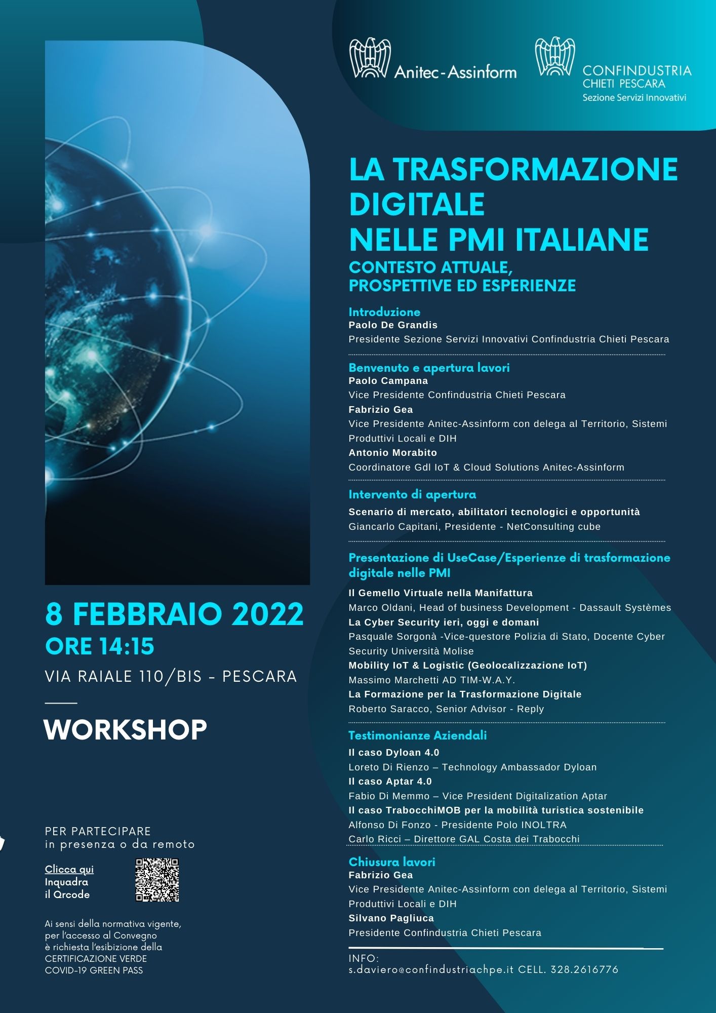 La Sezione Servizi Innovativi della Confindustria Chieti-Pescara organizza per l’8 febbraio a Pescara un evento a carattere nazionale sul tema “La trasformazione digitale nelle PMI italiane: contesto attuale, prospettive ed esperienze”.